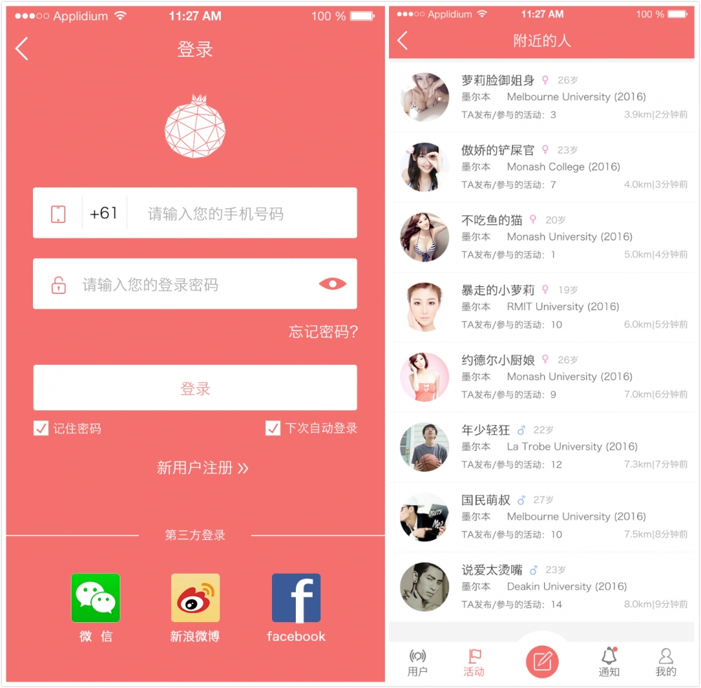 - 針對于海外留學(xué)生的活動發(fā)布和聚合APP,目標人群多為18-25歲之間,男性比例在55%左右,教會玩,眼界高,家境較好。 活動類別主要涵蓋招聘&培 訓(xùn)、教 育、美食、多人聚會、運動、演出&賽事、沙龍講座、旅游&戶外、主題節(jié)&市集和娛樂活動。 APP根據(jù)用戶所在定位、所在城市和其學(xué) 校向其匹配其最有可能參與的活動。通過在APP內(nèi)綁定手機號、微信等社交信息,使得活動發(fā)布者和參與者更容易聯(lián)系到一起。平臺保證活動真實性、透明度,并傳達多層次社交的理念。
