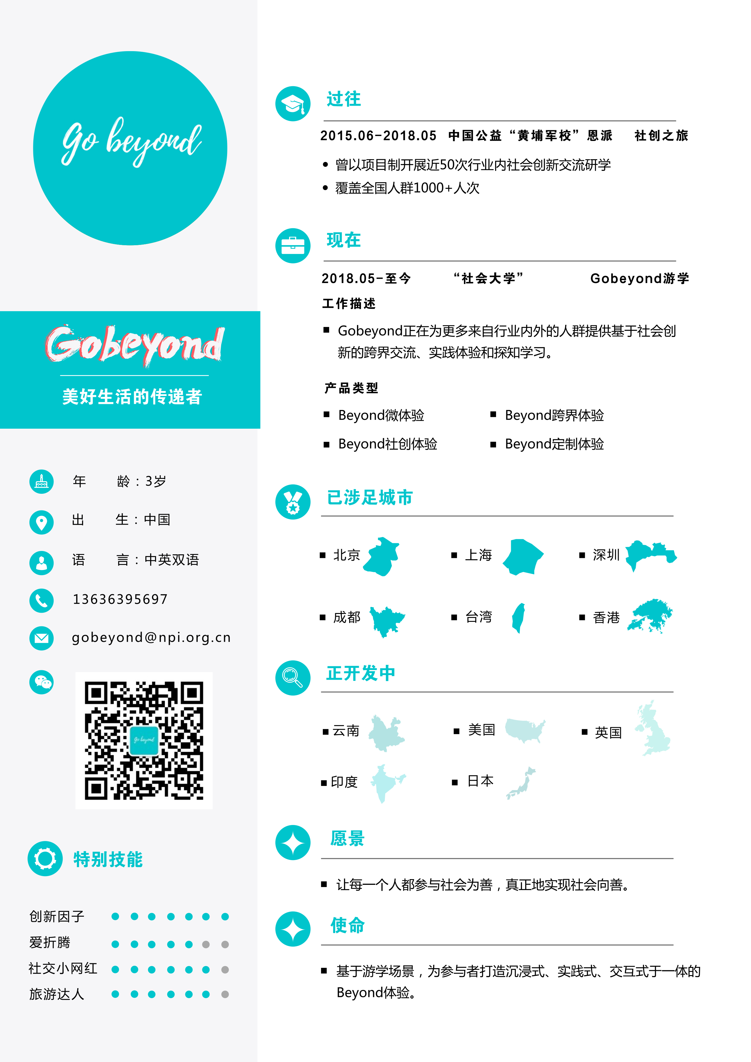 - Go Beyond簡(jiǎn)介 Go Beyond意指“超越”,音似“夠別樣的”。依托恩派的資源網(wǎng)絡(luò),Go Beyond旨在為社會(huì)創(chuàng)新業(yè)內(nèi)人士提供深度專業(yè)、寓學(xué)于游的定制體驗(yàn)。此外,Go Beyond還計(jì)劃為大眾提供豐富有趣、主題鮮明的社會(huì)創(chuàng)新體驗(yàn)。Go Beyond希望每一個(gè)人都能通過(guò)社會(huì)創(chuàng)新體驗(yàn),發(fā)現(xiàn)社會(huì)有善,參與社會(huì)向善。 Go Beyond特色 面向日新月異的全球互聯(lián)時(shí)代,Go Beyond計(jì)劃將社會(huì)創(chuàng)新游學(xué)升級(jí)為更具時(shí)代感的創(chuàng)新產(chǎn)品,創(chuàng)造基于社會(huì)創(chuàng)新的新興游學(xué)場(chǎng)景,打造集賦能教育、實(shí)踐體驗(yàn)于一體的復(fù)合式游學(xué)產(chǎn)品,制造深入情境的互動(dòng)氛圍,營(yíng)造全球社會(huì)創(chuàng)新的社交網(wǎng)絡(luò)。 Go Beyond產(chǎn)品 Go Beyond現(xiàn)有四個(gè)品牌產(chǎn)品,分別為Beyond微體驗(yàn),Beyond跨界體驗(yàn),Beyond社創(chuàng)體驗(yàn),以及Beyond定制體驗(yàn),分別從不同人群、不同領(lǐng)域、不同程度讓大眾感受體驗(yàn)別樣的社會(huì)創(chuàng)新教育。