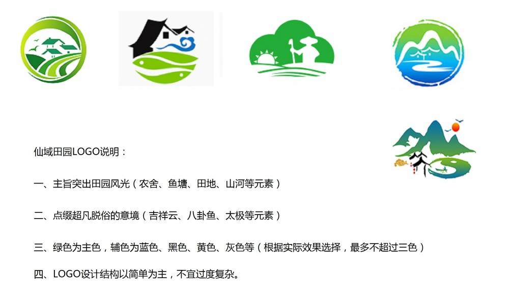一、主旨突出田園風(fēng)光(農(nóng)舍,魚塘,田地,山河等元素) 二、點(diǎn)綴超凡脫俗的意境(吉祥云,八卦魚,太極等元素) 三、綠色為主色,輔色為藍(lán)色,黑色,黃色,灰色等(根據(jù)實(shí)際設(shè)計(jì)效果選擇,最好不超過三色) 四、LOGO設(shè)計(jì)結(jié)構(gòu)簡單為主,不宜過度復(fù)雜。